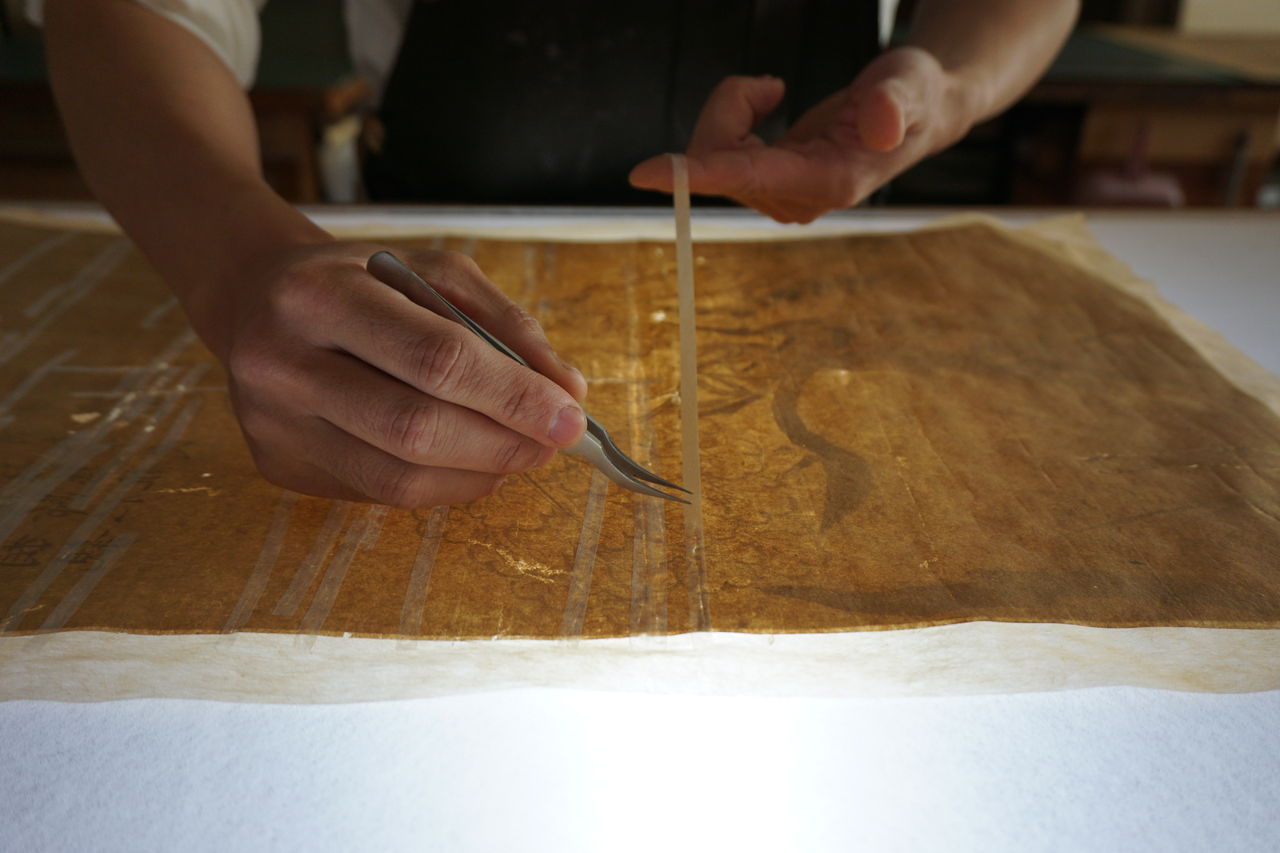 2019年05月22日 折れ伏せ作業 掛軸の修繕で行う折れ伏せ(処置)作業の風景です。横折れや破れの甚だしい本紙(作品)を裏面から和紙で補強しているのです。折れた箇所全てに施すため、膨大な時間を要しますが、これを行うことにより損傷部分は改善され、作品を守ると同時に折れ目もなくなることで、作品本来の美しさを取り戻すことができます。Instagramにて動画公開中! ↓ ↓https://www.instagram.com/p/BxzvjoCDBms/ 「◆表装ラボ◆」カテゴリの最新記事