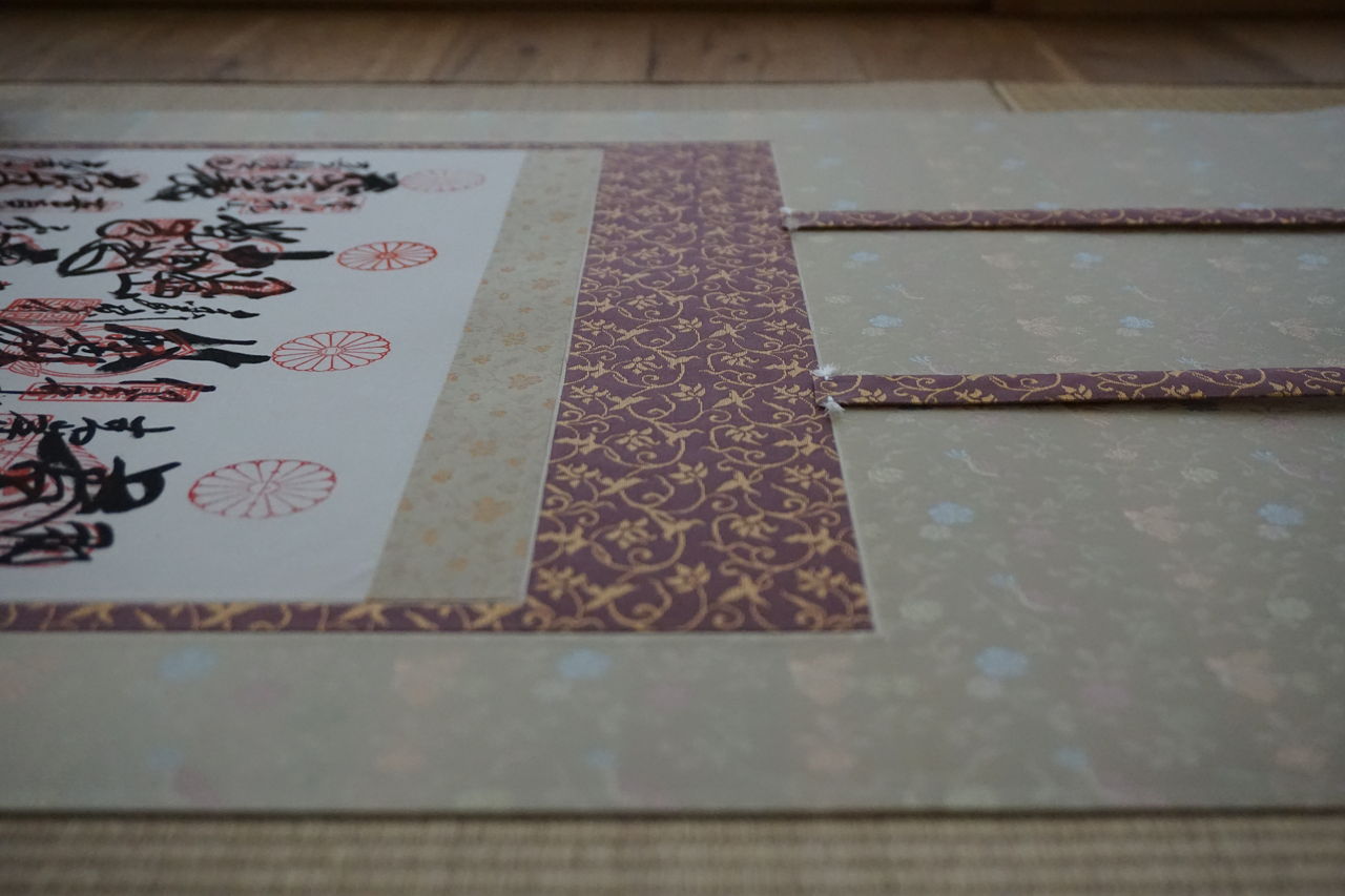 2017年09月21日 女性的な掛軸(西国三十三ヶ所霊場) 掛軸は、表具の色味によって大きく印象を変えることができます。故に、本紙(ご朱印軸)と表具のバランスを気をつけないと、残念な掛軸になってしまいます。ご依頼主の好みと僕のスパイスで本紙に相応しい、表具の取り合わせをすることが一番の理想です。だから、表装カタログ通りの掛軸は、機械的に見えてしまいがちです、、、今回の掛軸は、ご依頼主の奥様の好みと表具のバランスがとても合った、品の良い仕立てになりました。