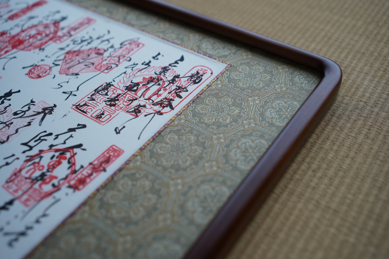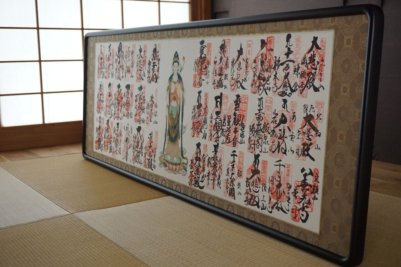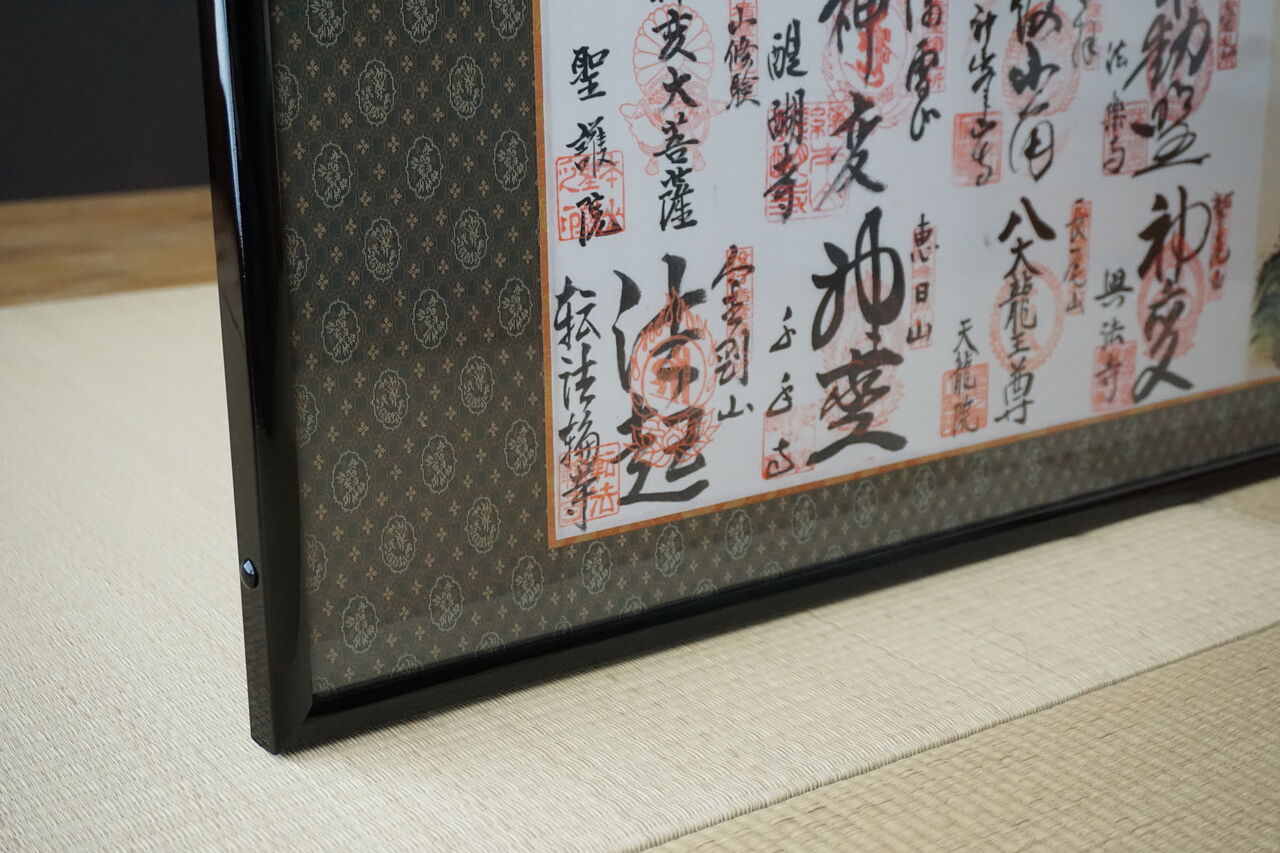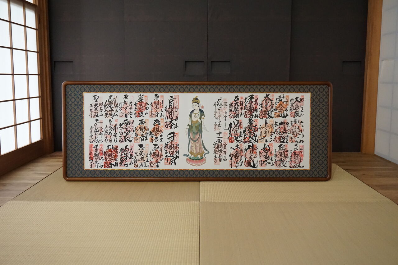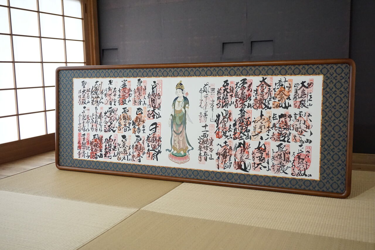 西国観音曼荼羅・額装を掲げるスペースに制限がある中で、ご依頼主がイメージする表具(取り合わせ)にしたいという熱い想いを表具師として出来る限りお答えさせていただきました。