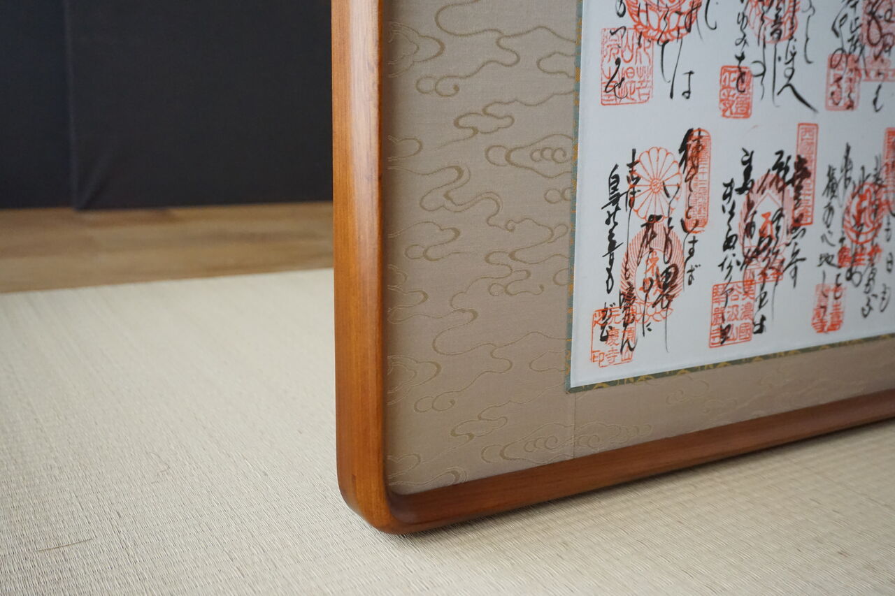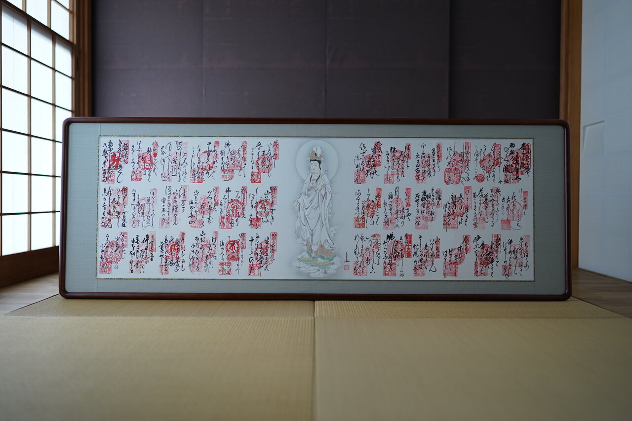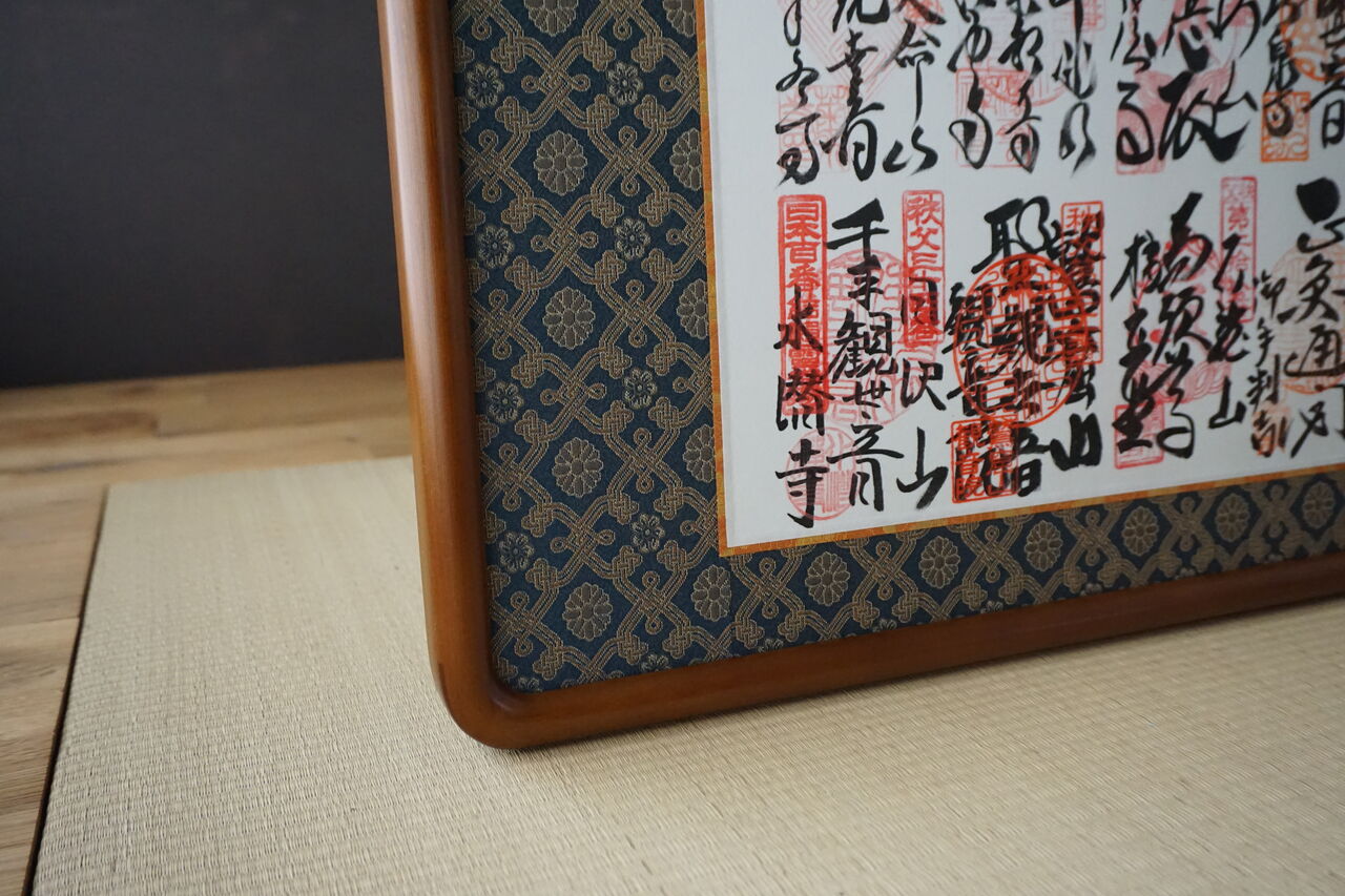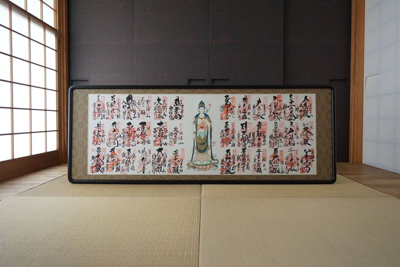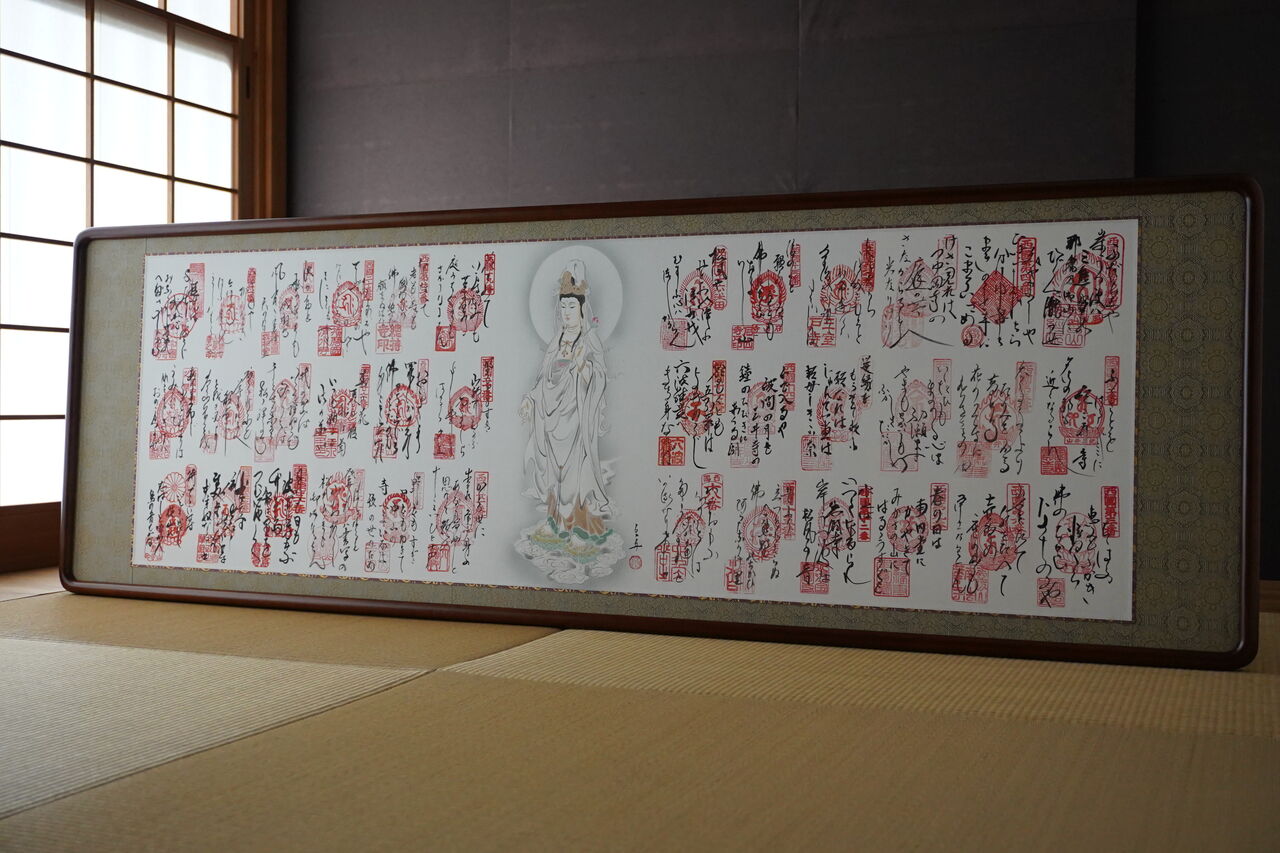 西国観音曼荼羅・額装を掲げるスペースに制限がある中で、ご依頼主がイメージする表具(取り合わせ)にしたいという熱い想いを表具師として出来る限りお答えさせていただきました。