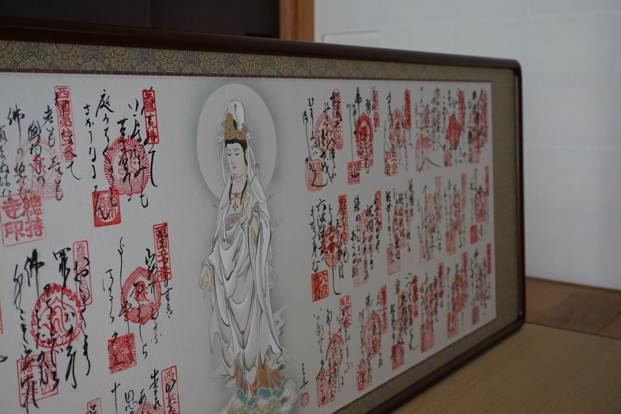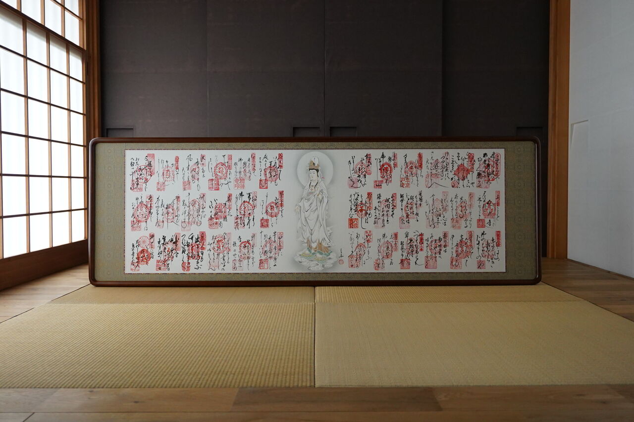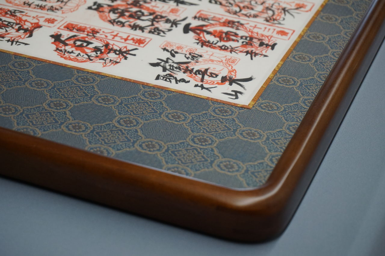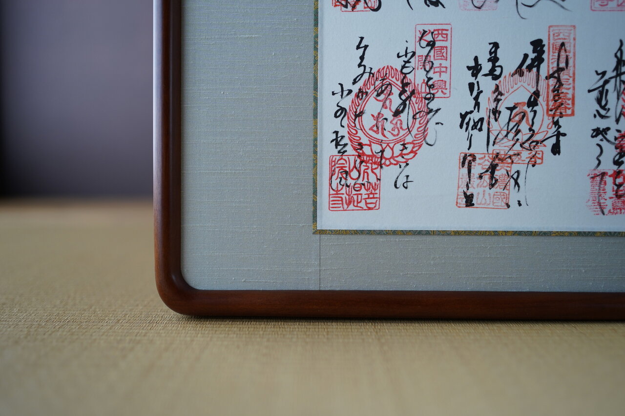 西国観音曼荼羅・額装を掲げるスペースに制限がある中で、ご依頼主がイメージする表具(取り合わせ)にしたいという熱い想いを表具師として出来る限りお答えさせていただきました。