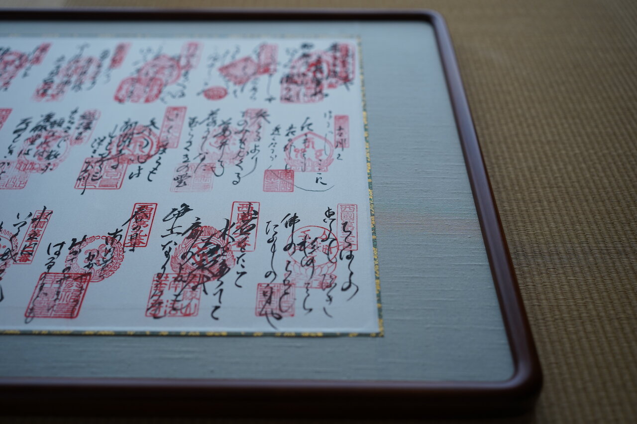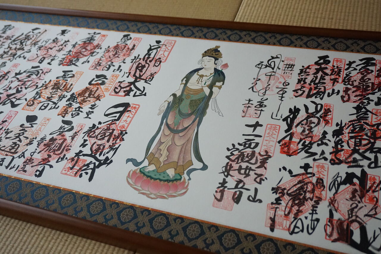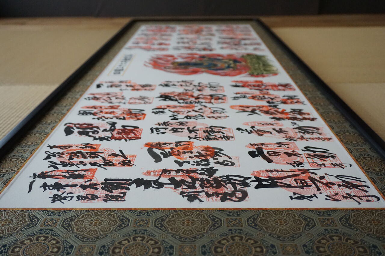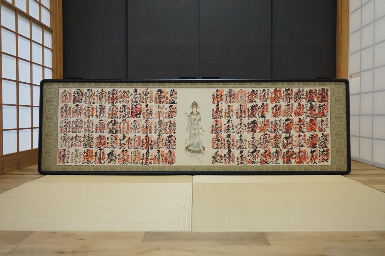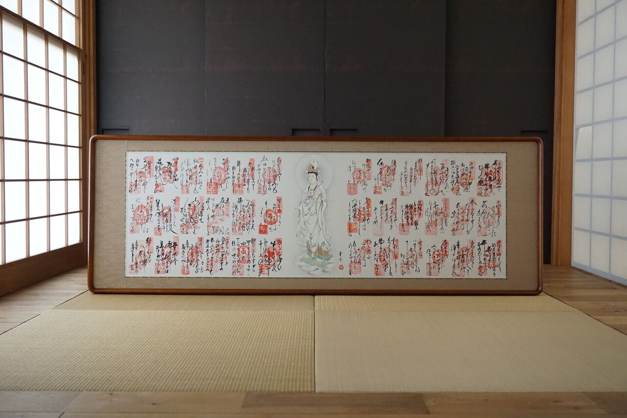 西国観音曼荼羅・額装を掲げるスペースに制限がある中で、ご依頼主がイメージする表具(取り合わせ)にしたいという熱い想いを表具師として出来る限りお答えさせていただきました。