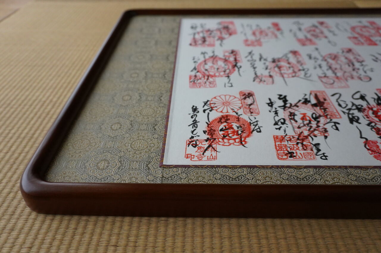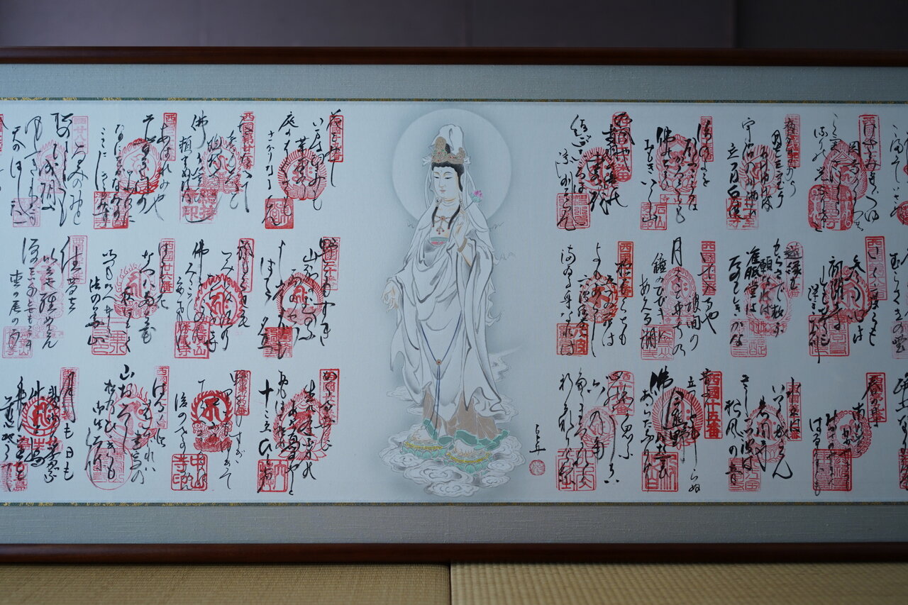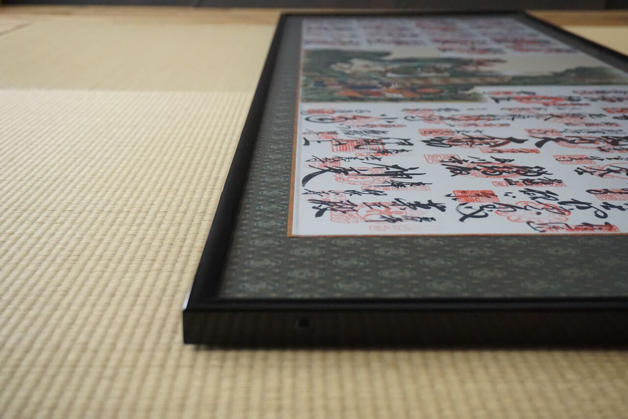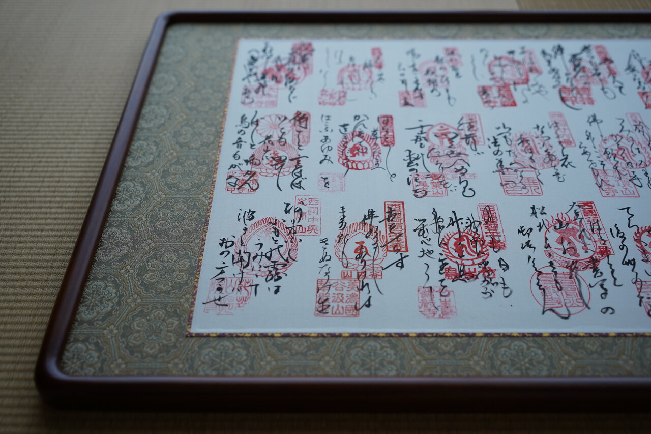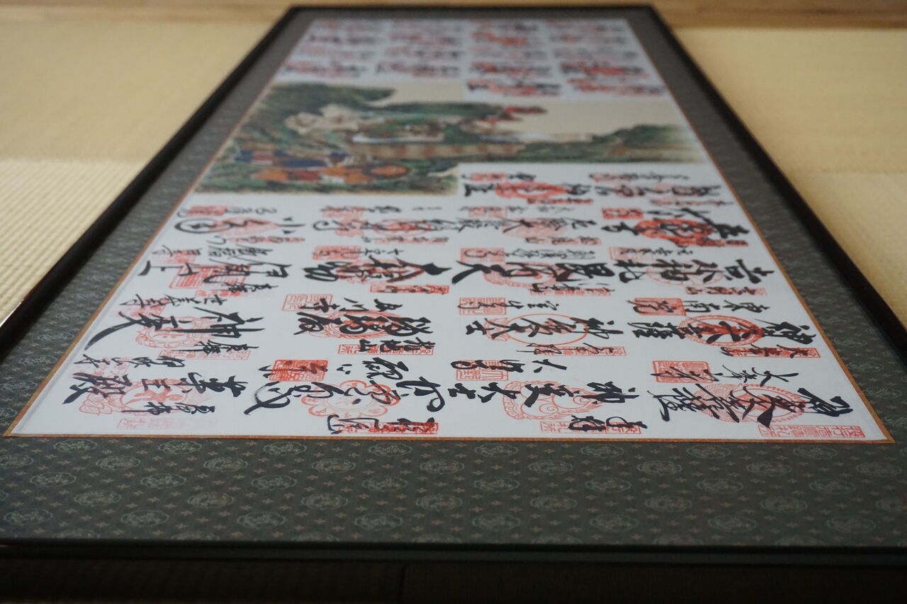 西国観音曼荼羅・額装を掲げるスペースに制限がある中で、ご依頼主がイメージする表具(取り合わせ)にしたいという熱い想いを表具師として出来る限りお答えさせていただきました。