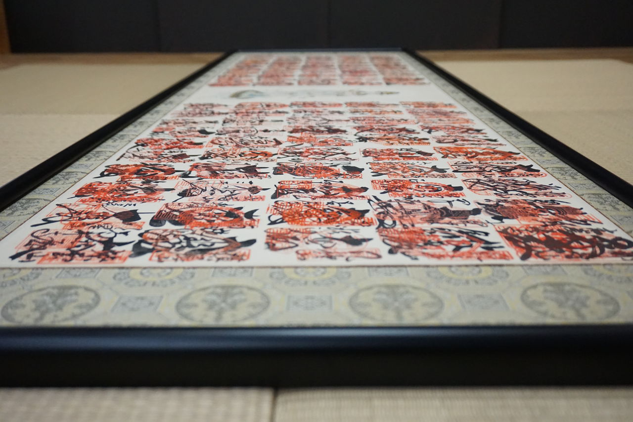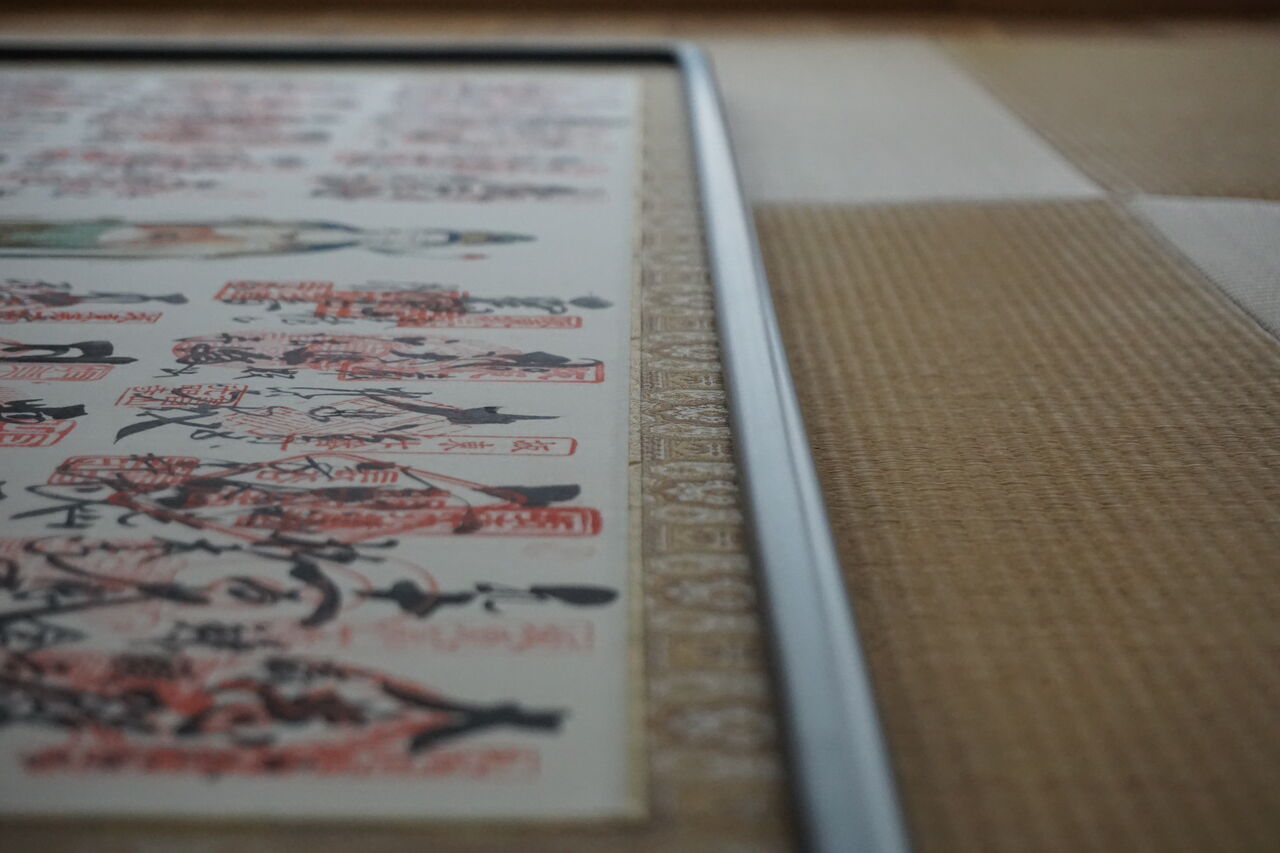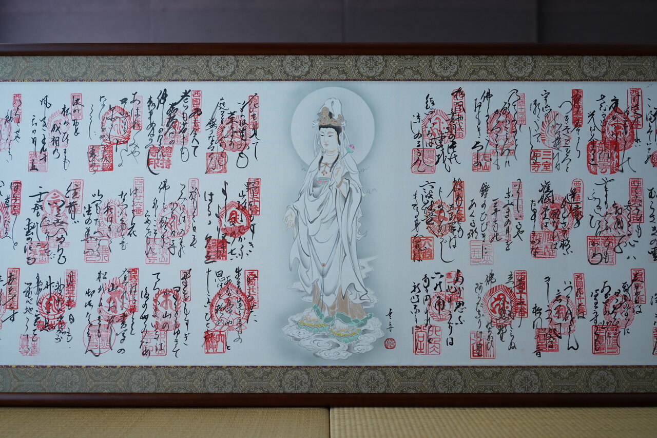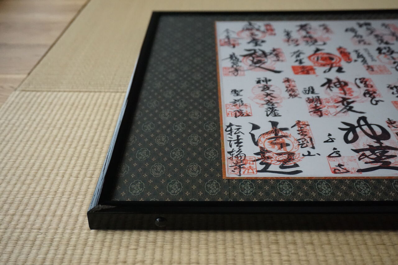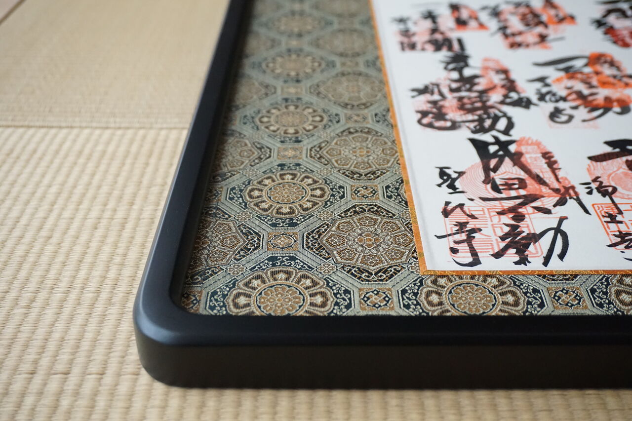西国観音曼荼羅・額装を掲げるスペースに制限がある中で、ご依頼主がイメージする表具(取り合わせ)にしたいという熱い想いを表具師として出来る限りお答えさせていただきました。