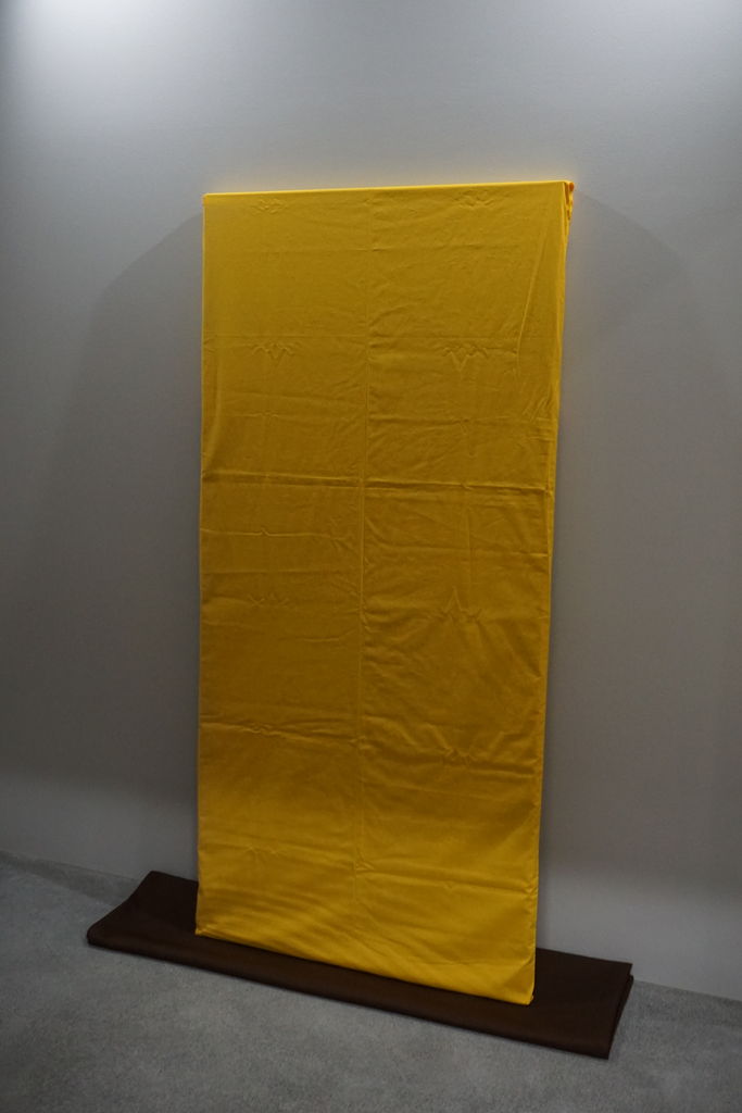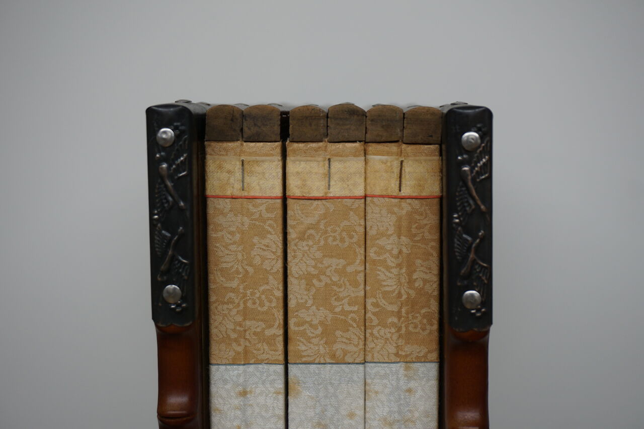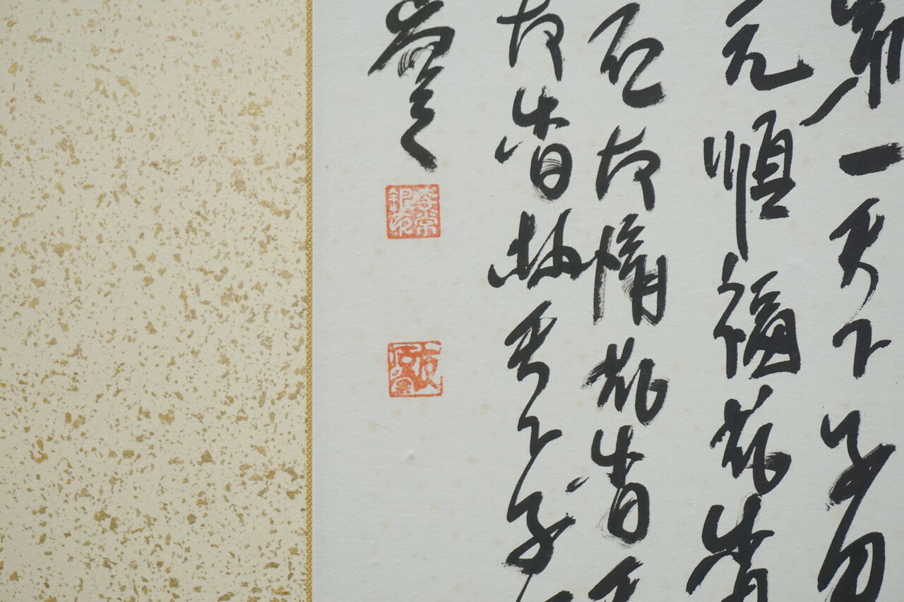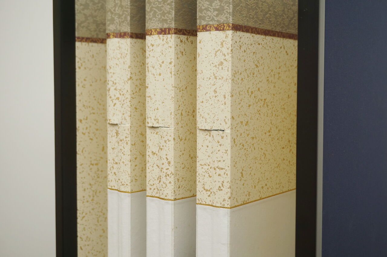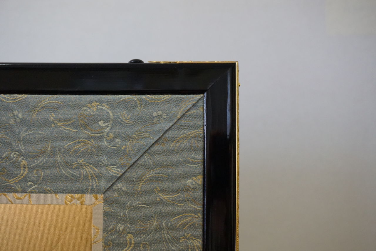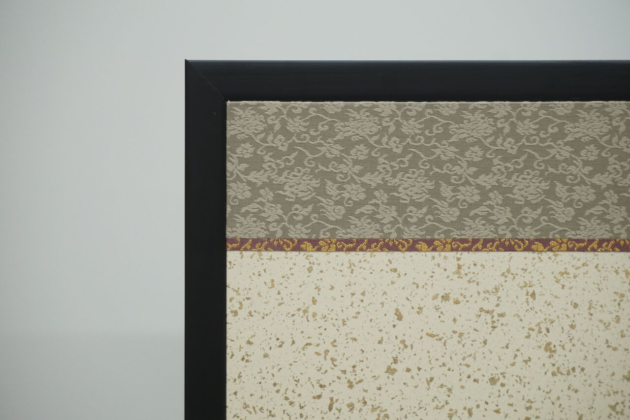 天地の緞子縁取り(太目部分)と本紙筋廻しの色味(金茶色)を合わせることによってトータルバランスを考えいています。