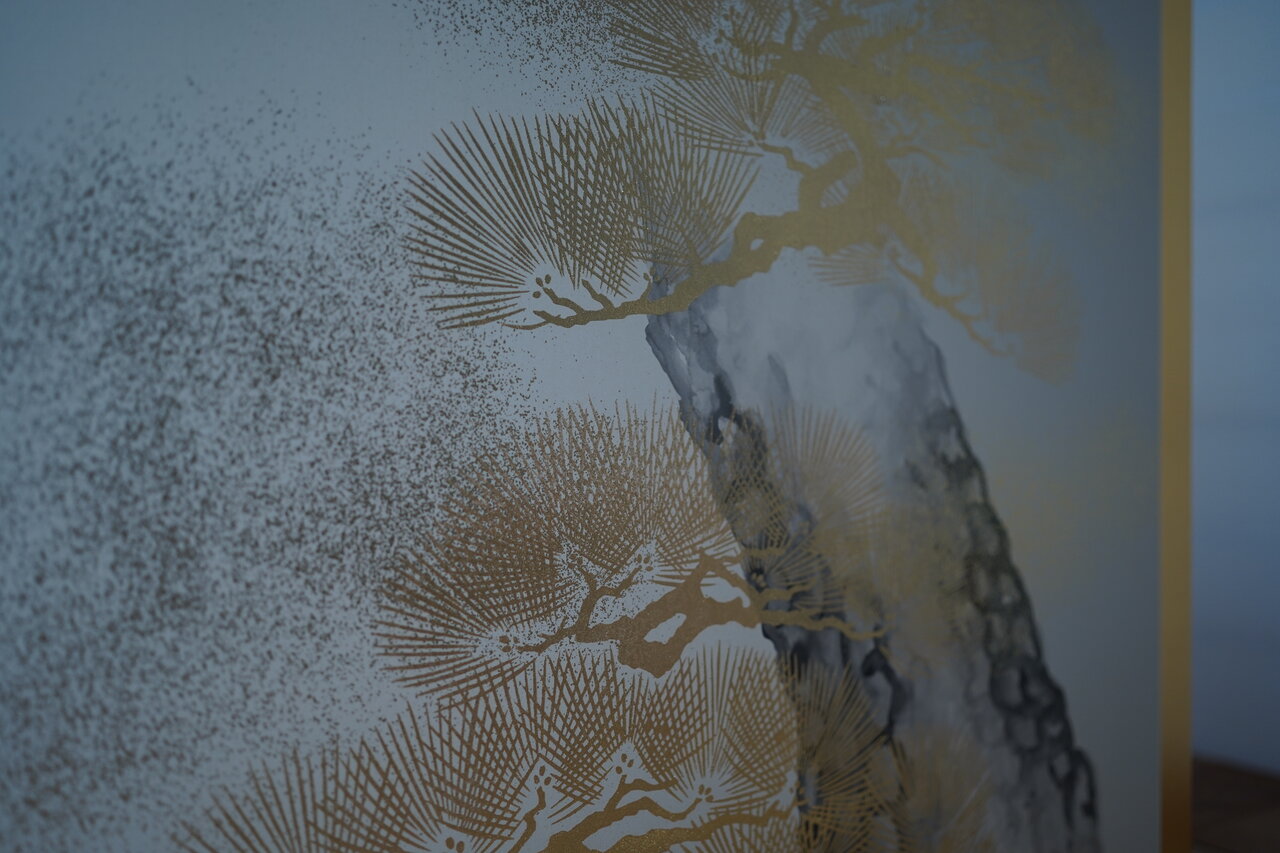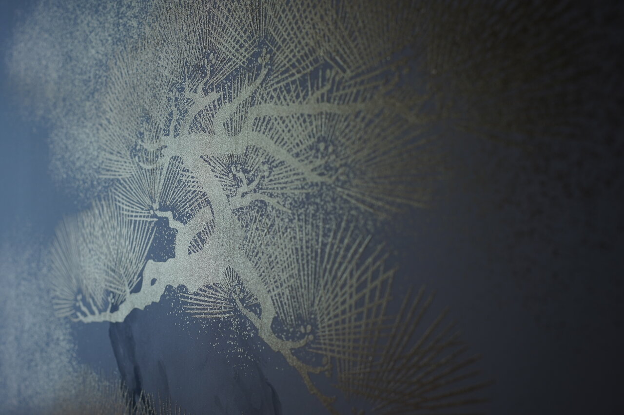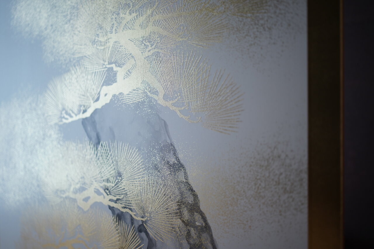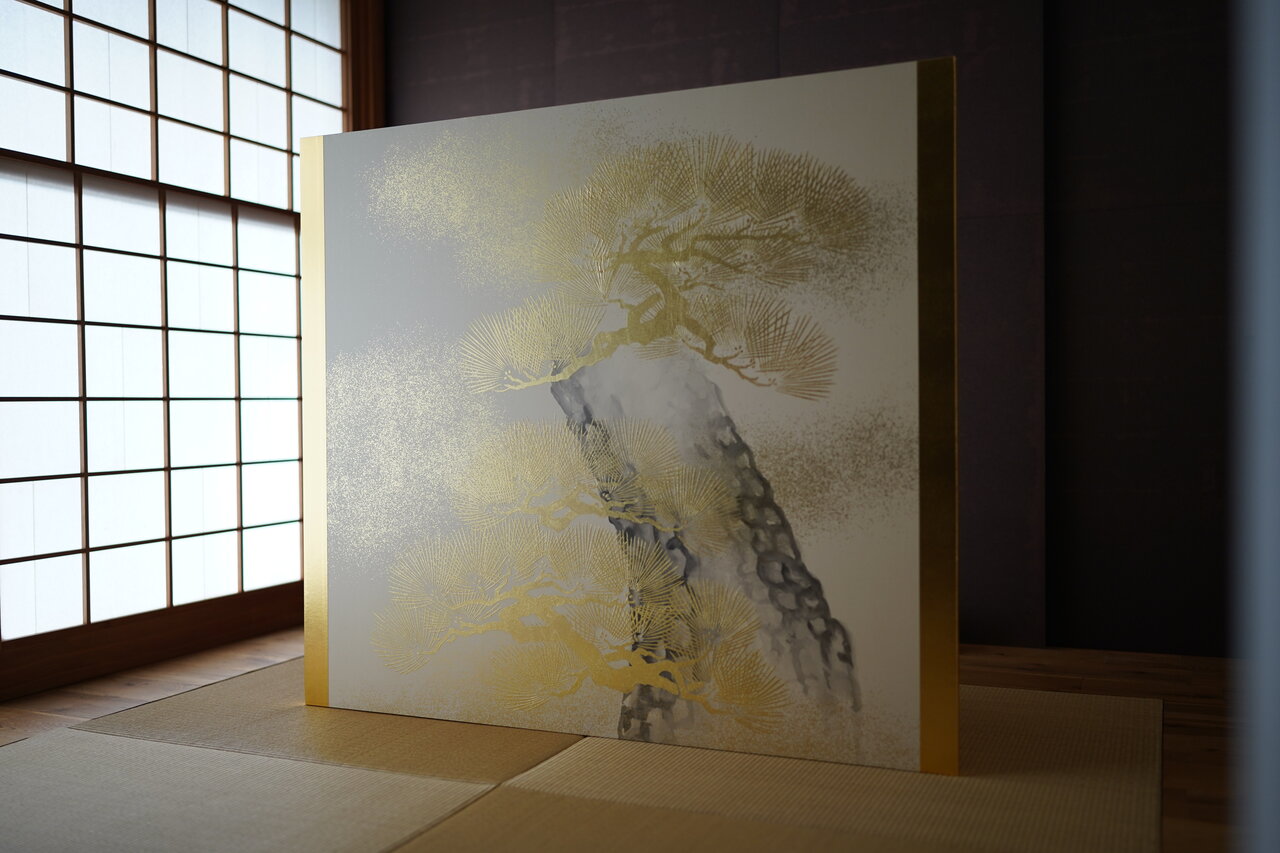 先日、修繕を終えた本金屏風(井芹蘇泉:作)をご覧になるため、ご依頼主(東京都:A様)とご親戚(滋賀県:B様2名)のお三人で松月堂へお越しいただきました。
