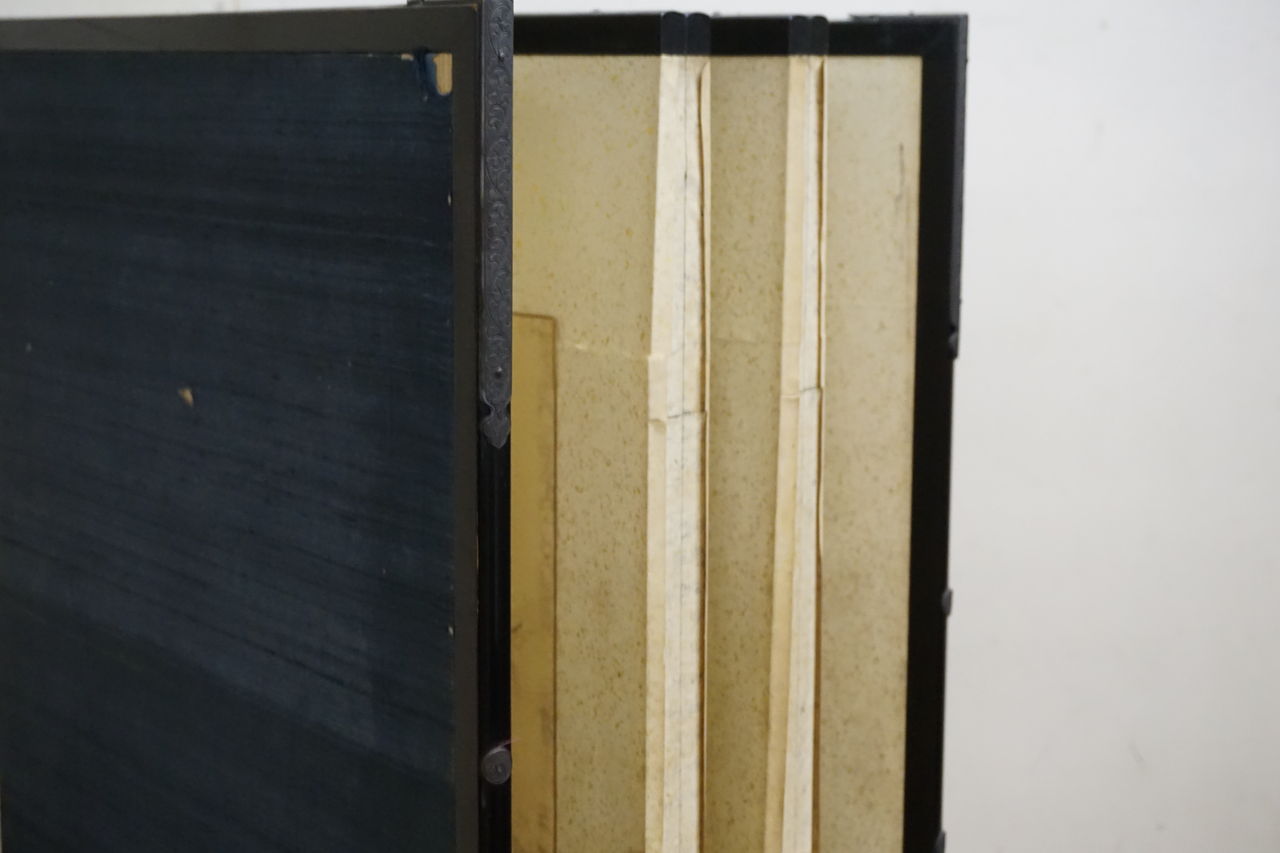 現状の屏風は仕立てが粗悪な為、再利用は不可。おそらく本紙8枚の染みの一番の原因は、屏風下地によるものかと推測されます。